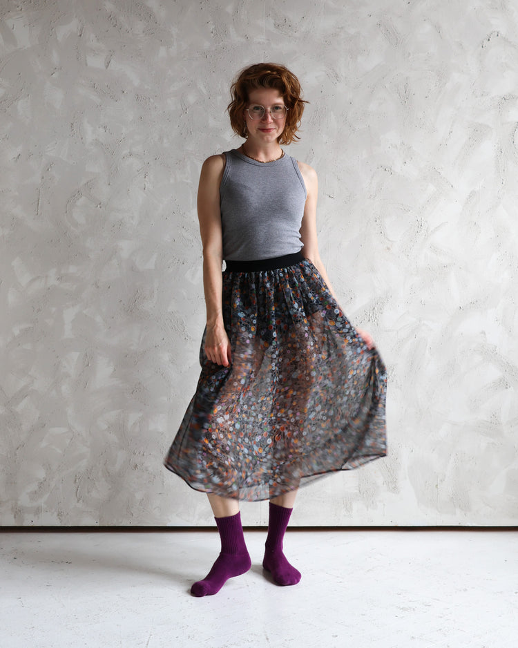 Inspired by the Off-Duty-Ballerina aesthetic, the Pavlova is a midi-length silk chiffon skirt with sewn-in bamboo bloomers. She's playful and sexy, and irresistibly fun to dance in! Pair with opaque black tights if you're feeling a little less daring.